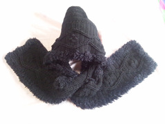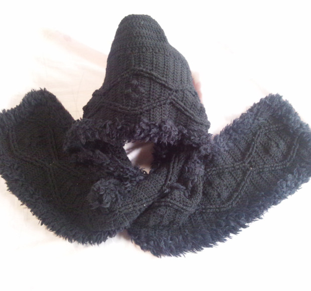 娘にお願いされて作ったフード付きマフラー*仕上げのファーの毛糸が良く見えなくて大変でした。