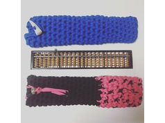 学校の保護者証ケースの上部が割れてしまい、紐が取り付けられなくなったので、ズパゲッティで簡単にカバーを編んではめこみました。紐は元々ついていたものを再利用できました。