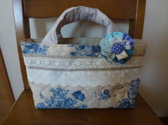 綿麻の涼しげな布をパンドラハウスさんで見つけて夏のバッグを作りました。肩に掛けたときにジャストサイズになるように、切り替え上部を自分が着てるタンクトップから型紙をとりました。コサージュは合皮を土台にレースとはぎれとくるみボタンで。