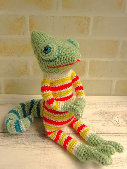 カメレオンが好きなので、少し大きいサイズの編みぐるみを作りました。