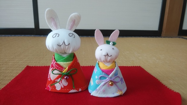 オリジナルの作品です。すべて手縫いです。ちなみに大きいウサギが着ているのは、私が子供の頃(昭和50年頃)の着物です。