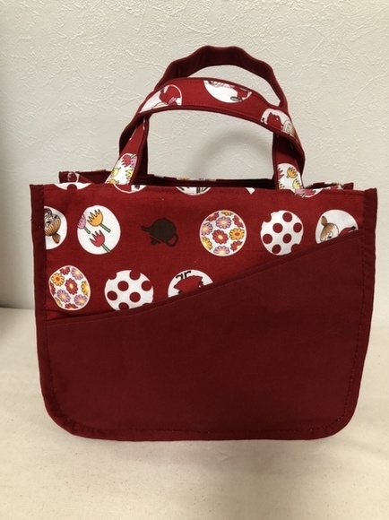 赤いリトルミィの生地を使って小さめのトートバッグを作りました。裏に接着芯をはって丈夫に仕上げました。中にポケット2つ外側に1つあり、たくさん物が入ります。
