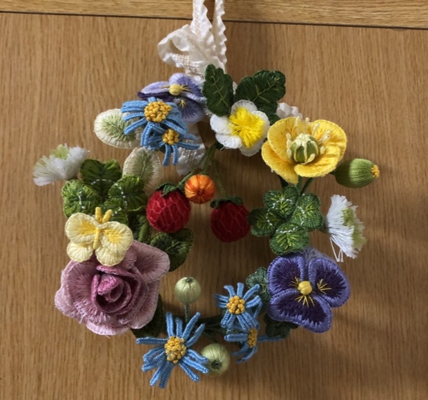 刺繍は割と苦手なので、苦心しましたが、思ったより快心の出来で気に入っています。玄関に飾って、気分上げます!