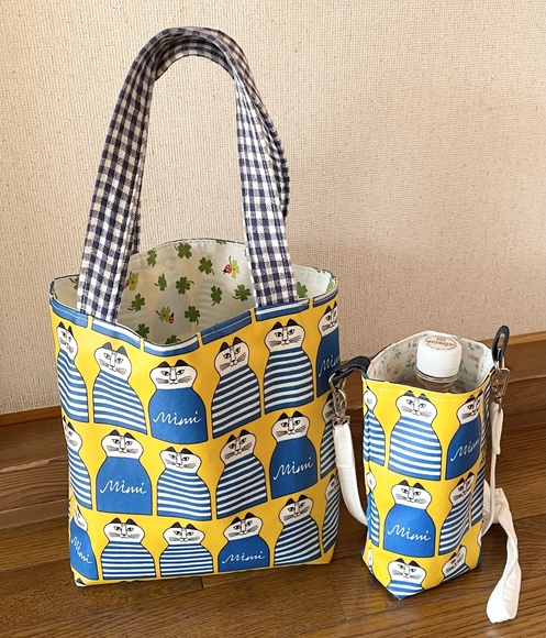 お気に入りのビニール素材で、ミニトートバッグとペットボトルやスマホが入る肩掛けバックをつくりました。買い物や散歩の時に便利です。可愛くて目立つので,アクセントになります。小さめバックですが,内側にポケットを3個つくりました。カギやリップなど迷子にならない工夫をしました。