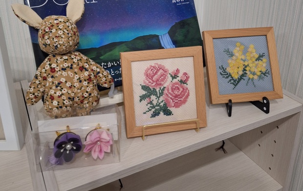 クロスステッチとうさちゃんとつまみ細工のコラボ