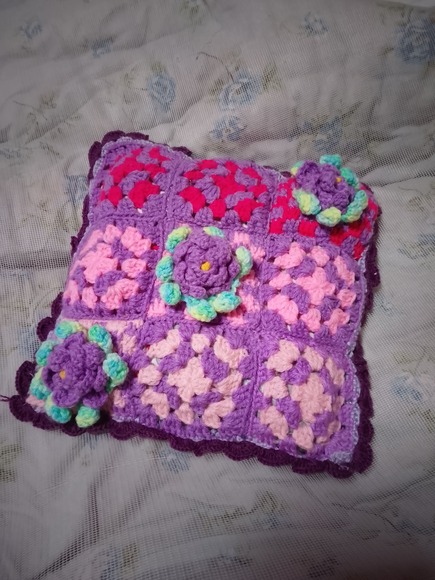 周りは濃い紫色の毛糸を長編みで飾り編みをしています。