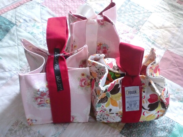 リボン付きの巾着を作りました。ちょっとしたプレゼントやお裾分けを入れるのに可愛らしいです。