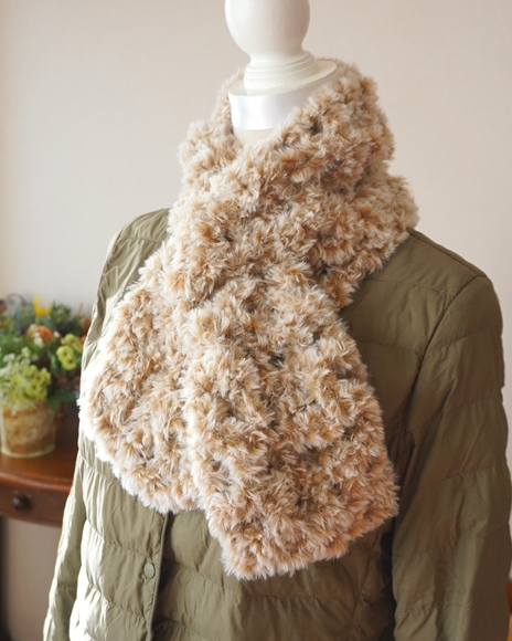 とても手触りのいいモフモフ毛糸(EXTRAFUR)を発見。近傍にあったマフラーのサンプルを見て簡単に編めそうと1玉購入。編み図をいただきさらに店員さんからご丁寧な補足説明。2時間程度で完成。とても気に入ってます。